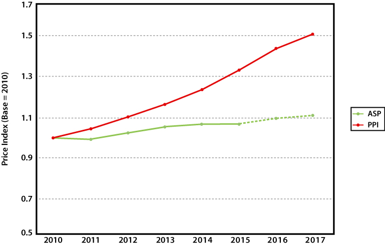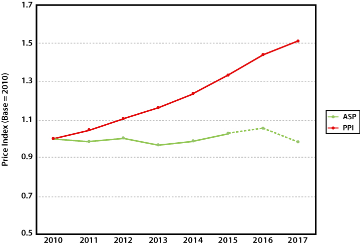 In most (if not all) cases, the price trend shown in these figures is a combination of individual product ASPs weighted by their respective Part B utilization as reported by CMS through 2015. At the time of this writing, utilization data were not available for 2016 and 2017. The trends reported here are projected by carrying forward the observed Part B utilization in 2015 and reflected by the dashed (versus solid) line.